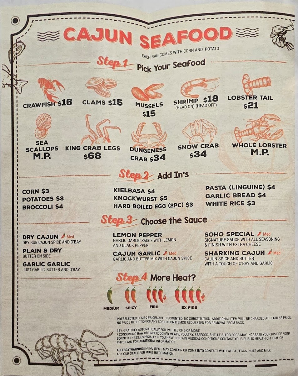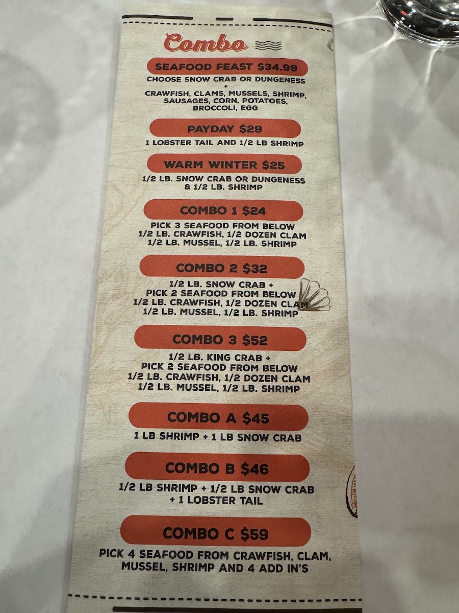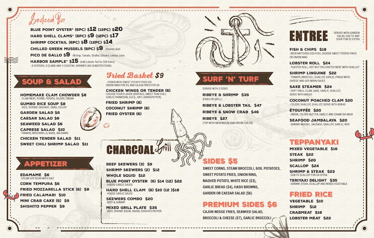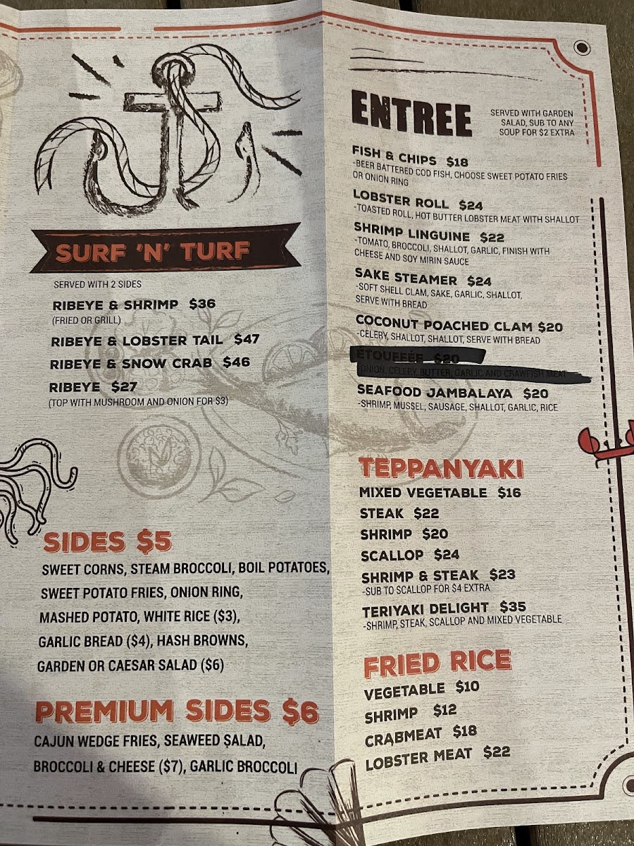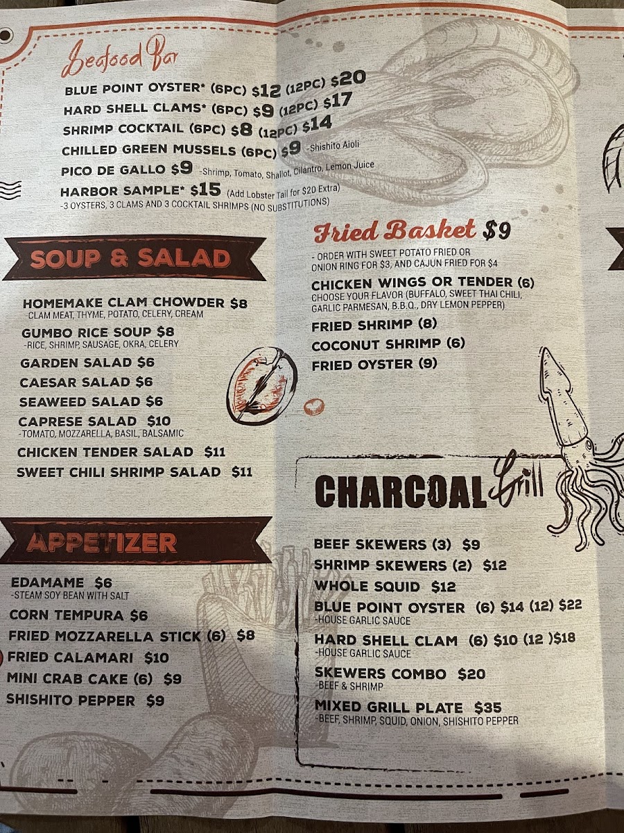 The menu leans into classic seafood boil fare—think rock shrimp, steamed clams, and crawfish—alongside grilled items like oysters and scallops, providing a satisfying variety for those who enjoy fresh, flavorful shellfish. For those wanting something a little different, options like ribeye steak, shrimp fried rice, and orange chicken are available, adding heartier plates to the mix.